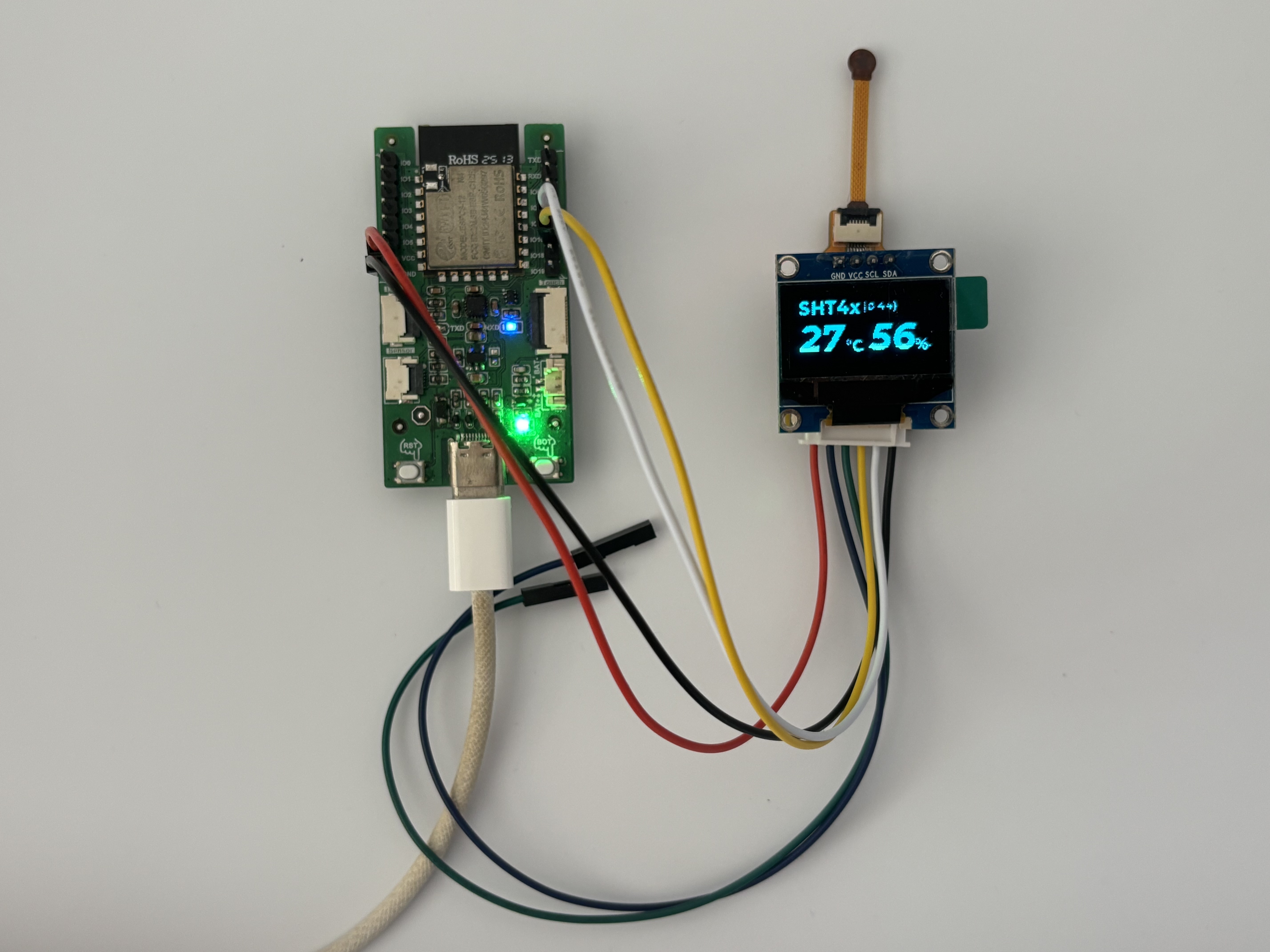 主控板通过杜邦线连接转接板,读取温度和湿度,并在 OLED 屏幕上显示。