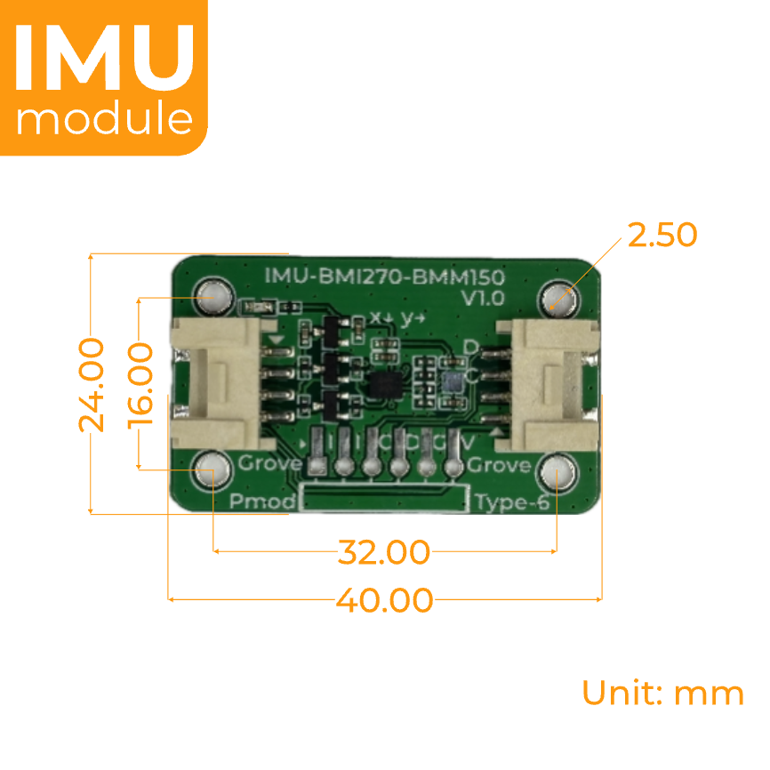 IMU Module 是一款9轴的惯性运动测量单元,采用六轴姿态传感器(BMI270)、三轴地磁式传感器 (BMM150)的方案,测量和检测物体的加速度和角速度 、地磁场方向和强度,可以通过 I2C 接口进行通讯, 可以按需选择 Grove 线和主控板连接或者采用杜邦线与主控板连接。广泛应用于导航 、自动化控制 、机器人技术 、飞行器导航 、地理定位等领域。